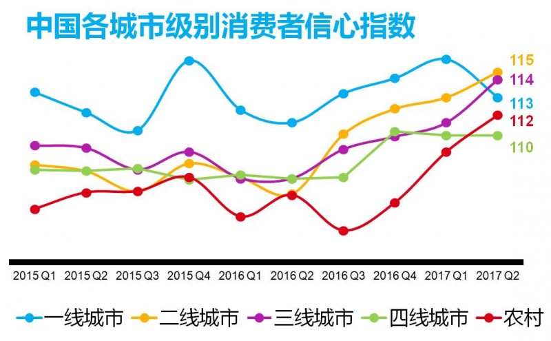 尼尔森报告显示,上线城市消费者信心指数继续保持高位,下线城市及农村地区增长态势明显。