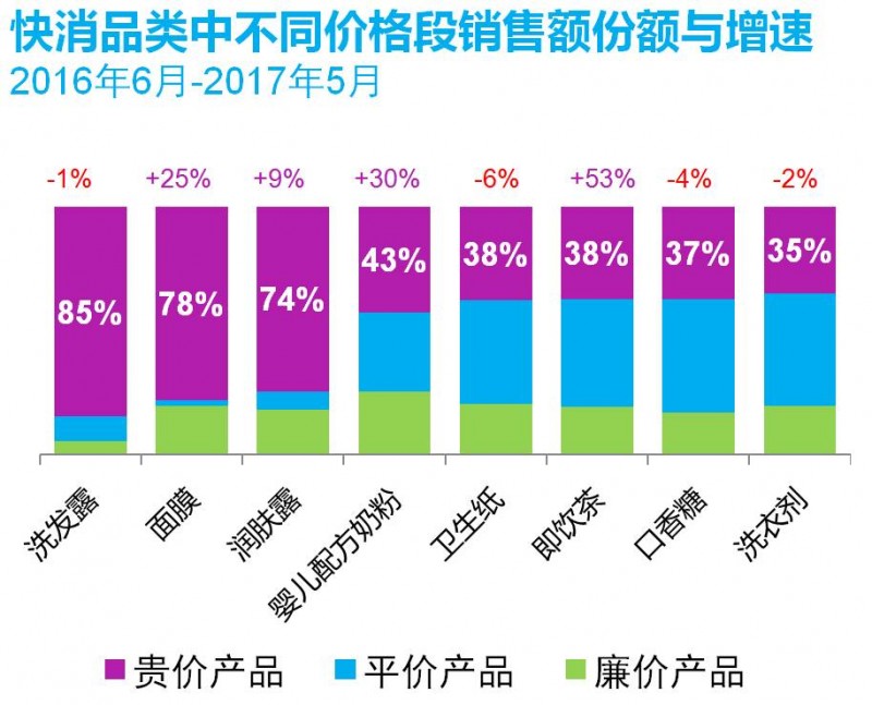 中国快消品升级指数不断攀升,但不同品类所处阶段不同。数据显示,洗发露、润肤乳、面膜三个品类中贵价商品所占比例分别为85%、74%、78%,面膜增速最快,达25%;即饮茶、婴儿配方奶粉贵价产品所占比例仅为38%和43%,但即饮茶贵价产品的销售份额增速达53%,婴儿配方奶粉的增速也达到43%的高位;口香糖、洗衣液、卫生纸品类贵价产品占比较小,增速较为缓慢。