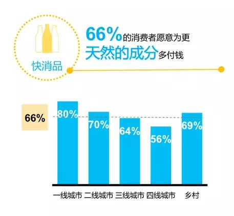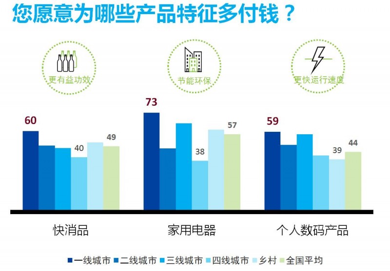 80%的一线城市消费者更青睐有天然成分的快消品,远远超过全国平均水平(66%);75%的一线城市消费者愿意为电子产品的先进技术优势多付钱;72%的农村地区消费者更愿意为了家用电器的结实耐用多付钱。