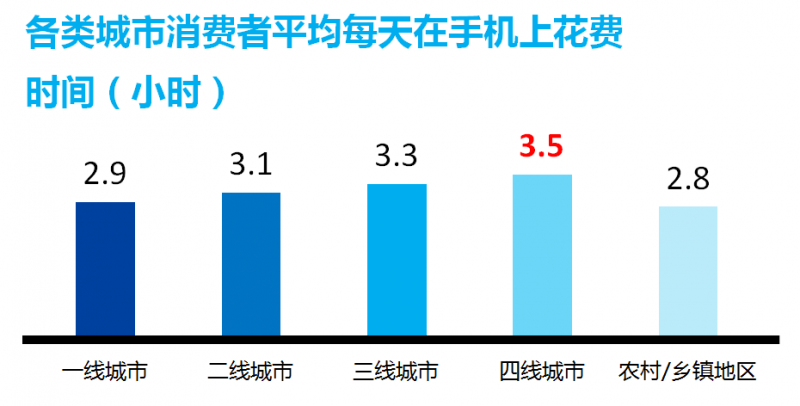 尼尔森数据显示,全国消费者平均在智能手机上花费3小时,其中一线城市为2.9小时、二线城市为3.1小时、三线城市为3.3小时,农村/乡镇地区为2.8个时,而四线城市对智能手机最为依赖,以3.5小时高居榜首。