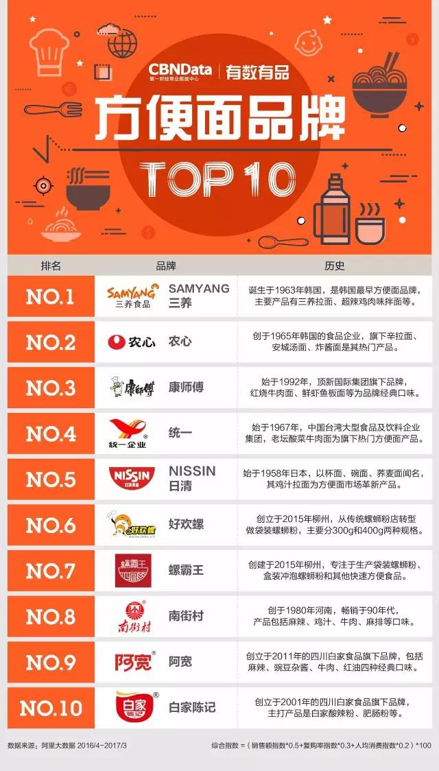 互联网打开了消费者触及世界各地商品的大门,同时也使他们在挑选环节投入更多的时间与精力,选择困难症也随之而来。为了帮助大家省时省力,缓解纠结,第一财经商业数据中心(CBNData)数据分析师通过分析2016年4月至2017年3月的阿里巴巴消费大数据,根据销售额、复购率、客单价(人均消费)指标综合评出了线上方便面十大品牌。
