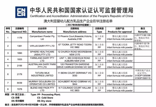 7月6日,国家认监委更新了澳大利亚婴幼儿配方乳品生产企业在华注册名单,其中,Camperdown Powder Pty Ltd公司被备注“自2017年07月06日,暂停在华注册资格”。