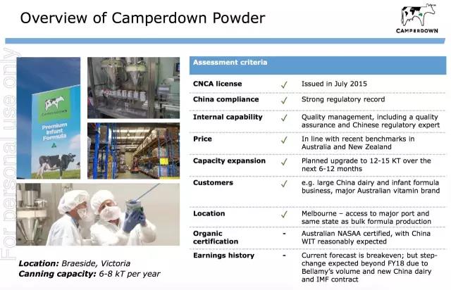6月13日,贝拉米宣布收购CamperdownPowder Pty Ltd公司90%的股权。Camperdown Powder是一家获得中国认监委认证的奶粉生产和罐装工厂,位于墨尔本布雷塞德(Braeside)。该项收购价格为2850万澳元(约合人民币1.5亿元)。