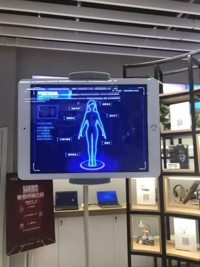 店内有一块试衣镜般的电子屏,顾客走进之后就会进行人脸识别,根据识别出的性别、年龄等画像,推荐顾客可能感兴趣产品,比如向男生推荐机械键盘、电脑外设,向女生推荐自拍杆、电动牙刷,向老年人推荐智能电饭煲、扫地机器人……