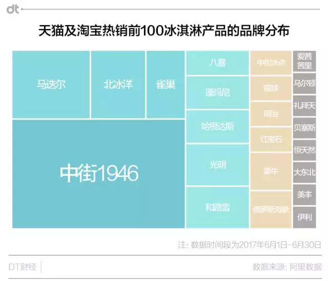 在DT君提取的天猫和淘宝2017年6月最热销的前100款冰淇淋中,中街1946的产品占了近四成,不论是雀巢等你们熟悉的传统冰淇淋品牌产品,还是马迭尔等上一代网红东北雪糕,都被它远远地甩在身后。