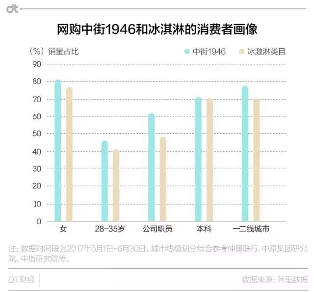 DT君提取了今年6月淘宝和天猫的网购冰淇淋消费者数据,可以看到,对比冰淇淋整个品类的消费者画像,中街1946在下面这些标签上的表现更为突出: