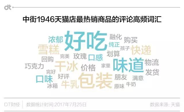 以中街1946天猫店中销量最高的“原味牛乳拼黑白半巧的12支组合装”为例。DT君采集了这个产品近2000条购买评论后看到,“好吃”最为关键——占了总评论数的将近一半(45.9%),另外“味道纯正”、“口感浓郁”这类关乎口味的赞美之词也绝不在少数,这自然征服了当中不少口味挑剔的中产妈妈。