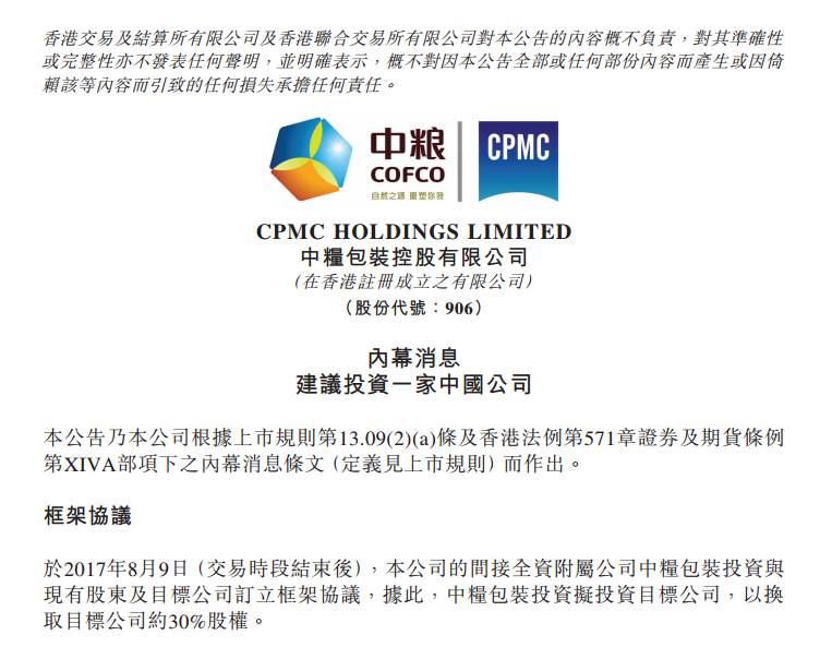 公开资料显示,中粮包装是中国最大的金属包装集团,主要从事食品、饮料及日化产品等消费品所使用包装产品的生产,拥有饮料罐、食品罐、气雾罐、金属盖、印铁、钢桶和塑胶等七大类主要包装产品。