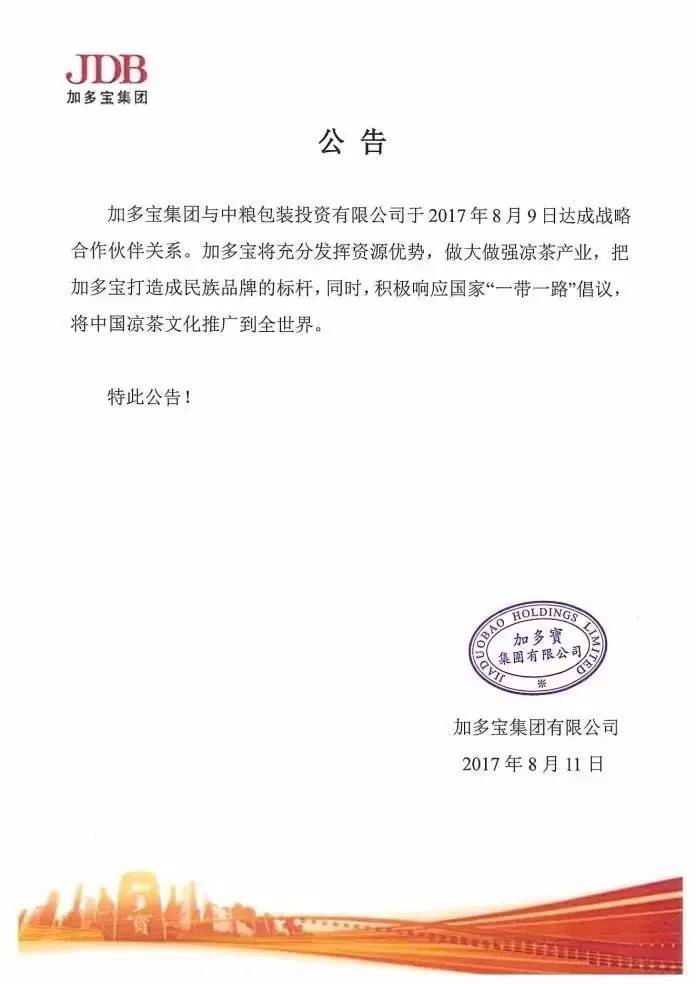 8月11日,加多宝也发布公告,正式宣布加多宝集团与中粮包装达成战略合作伙伴关系。
