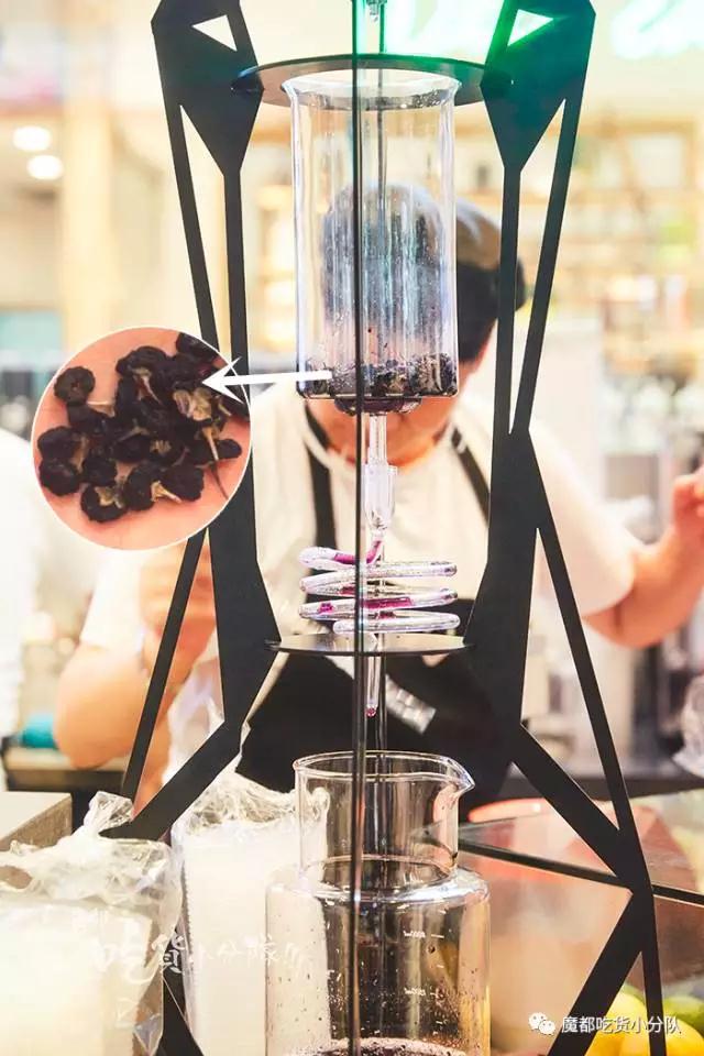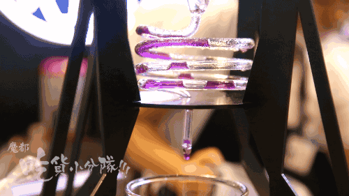 矿泉冰水慢慢滴漏到第二层,里面是原花青素含量最高的黑枸杞,来自青海柴达木盆地。花青素是水溶性的,一般是泡水喝。