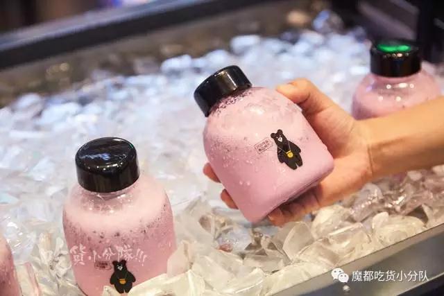 更方便携带的一款,浓稠的粉紫色莓果果昔,装在圆滚滚的瓶子里 。