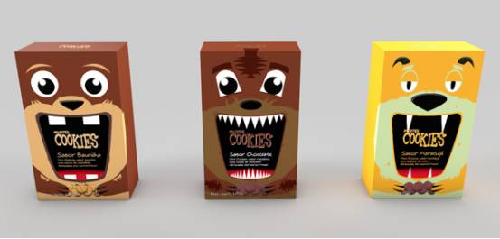 从动物的嘴巴里面取出食物,这个创意你觉得怎么样?以下这款设计,动物的嘴巴就是包装盒的开口,当宝宝们掏出饼干时,就像完成了一次“虎口夺食”的冒险游戏,十分有趣!