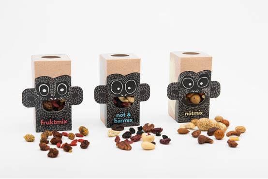 Exotic Snacks提出一个设想,让更多的孩子选择更健康的糖果,于是,坚果和浆果的奇妙组合便诞生了。设计师在包装上画上了猴子的形象,猴子们各异的表情和红黄蓝三种颜色代表了糖果不同的口味,让妈妈们在挑选食品时一目了然。