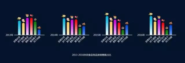 从成长性来看,销量增长较快的是坚果炒货,在2016年已成为销量占比最高的品类,肉干肉脯个表现出强劲的发展趋势,而蜜饯果干、糖果巧克力等品类则略显增长乏力。