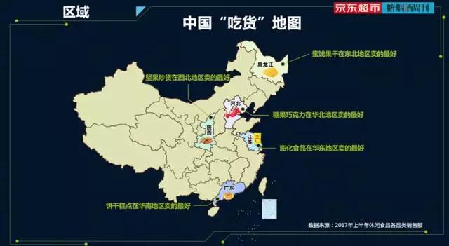 从销售区域来看,坚果炒货、蜜饯果干、糖果巧克力、膨化食品、饼干糕点则分别在西北、东北、华北、华东、华南区域销量最好。尤其让人感到意外的是,与常规想法不同,数据表明一二线城市对价格的敏感度要明显高于五六线城市,而看似粗犷的东北人则“精打细算”,高于西北、西南地区消费者。