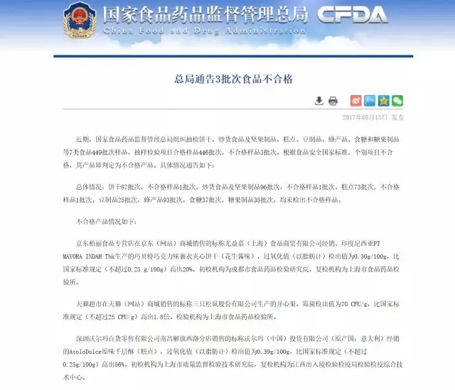 ◆ 总局关于3批次食品不合格情况的通告(2017年第135号)