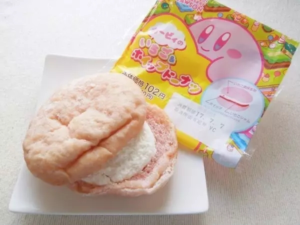 接下来是「卡比草莓奶油甜甜圈」,日币110元,草莓口味的甜甜圈内夹草莓奶油馅。