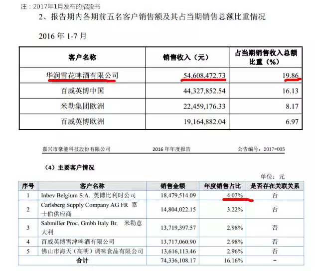 不过,斑马消费最关心的还是,2016年豪能包装的第一大客户到底是谁?当年发布的招股书说是华润雪花,而年报中又变成了百威英博。