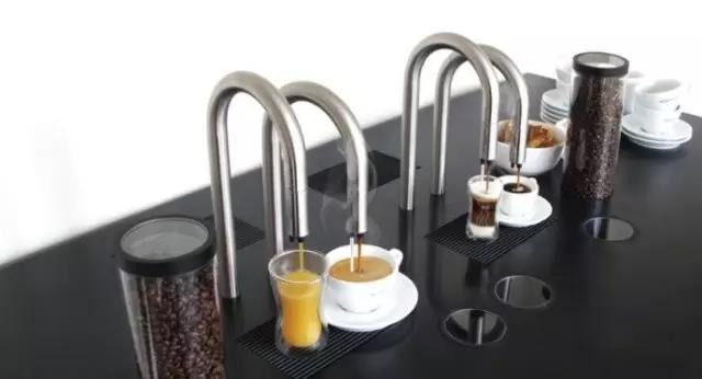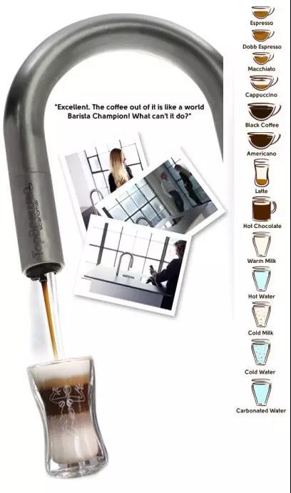 TopBrewer的咖啡机比较正确的说法应该是咖啡水龙头。真的让使用者只要打开水龙头就能喝到咖啡,而且还支援使用iPhone遥控,点一下iPhone,就能选择从水龙头中跑出哪一种咖啡!完全符合咖啡瘾患者的梦中情境!