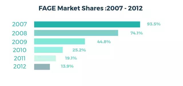 Fage,它就是Fage,作为希腊酸奶品类的开创者,Fage却从2007年93.5%的市场占有率,降到2012年的13.9% 。
