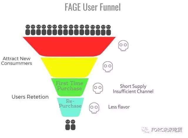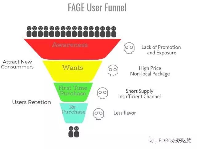 漏斗图展示的是Fage在拉新、留存时,消费者会遇到的几个门槛,这些门槛会阻碍消费者对Fage建构品牌认知,无法引导消费者产生购买和持续复购行为。