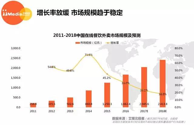 iiMedia Research(艾媒咨询)数据显示,中国在线餐饮外卖市场自2011年一直保持较高速增长,2016年市场规模达到1662.4亿元,增长率为33.0%,2017年市场规模预计将达到2045.6亿元,增长率将放缓,市场规模将逐步稳定。