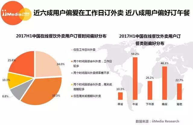 1、近六成用户偏爱在工作日订外卖 近八成用户偏好订午餐