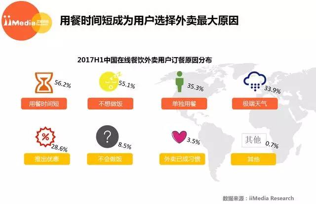 iiMedia Research(艾媒咨询)数据显示,用餐时间短成为用户选择订餐最大原因,占比56.2%,而不想做饭、单独用餐和极端天气也是用户选择较多的订餐因素。