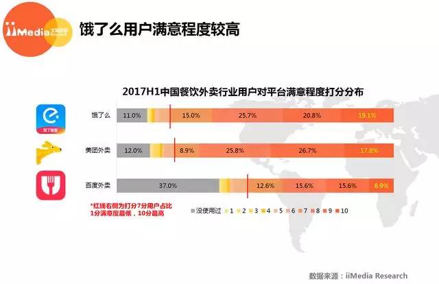 iiMedia Research(艾媒咨询)数据显示,2017上半年,各平台在线餐饮外卖用户对平台满意度评分中,为平台打分10分的饿了么用户占比19.1%,该部分比例位列各平台之首,同时超过八成饿了么用户为平台打分为7分及以上。
