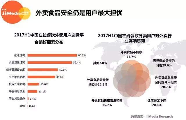 iiMedia Research(艾媒咨询)数据显示,分别有66.1%和59.4%的在线餐饮外卖用户认为配送速度和食品卫生情况影响其对平台的选择;而在在线外卖弊端的感知中,食品不健康被最多用户点名。