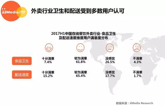 iiMedia Research(艾媒咨询)数据显示,对于用户比较关心的食品卫生和配送速度维度的调研中,69.2%的用户对于食品卫生持满意态度,80.6%的用户对于配送速度持满意态度。
