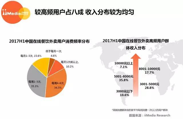 iiMedia Research(艾媒咨询)数据显示,2017上半年,平均每周至少进行一次在线外卖餐饮消费的高频用户群体占比接近八成,其中在线10.2%的用户平均每天消费一次及以上。