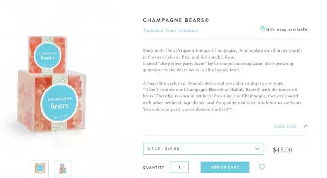 相应的,Sugarfina 的价格并不便宜。比如他们从德国进口的小熊软糖 CHAMPAGNE BEARS,最大的包装为 2.5 磅,其价格为 45 美元,相比之下,5 磅的德国哈瑞宝(Haribo)小熊糖在美国亚马逊的价格为 12.67 美元。