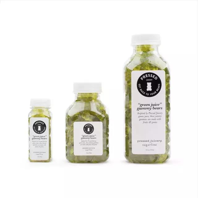 除了与葡萄酒品牌合作以外,Sugarfina 还曾经将愚人节玩笑兑现,与冷榨果汁品牌 Pressed Juicery 合作,推出了含有菠菜、苹果、柠檬、姜浓缩汁的 “Green Bear” 糖,而且糖果包装也设计成了果汁瓶。