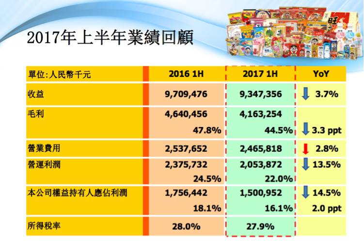 昨日下午,中国旺旺控股有限公司(以下简称“中国旺旺”)公布了今年上半年财报。截至2017年6月30日,其营收93.74亿人民币,较去年同期少了3.7%。毛利同比减少10.3%至41.63亿元,公司权益持有人应占利润同比减少14.5%至15.01亿元。