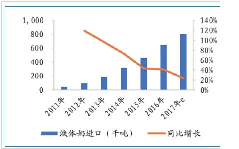 国内液态奶的需求依旧强劲,2016年依然保持41%的增速,USDA预测2017年中国液态奶将保持20%的增速。虽然目前预期液态奶和奶粉的进口量将会回升,但是2016年的人民币大幅贬值对于进口贸易形成了一定的冲击,预计2017年中国乳制品进口回暖会是一个缓慢的过程(如下图)。