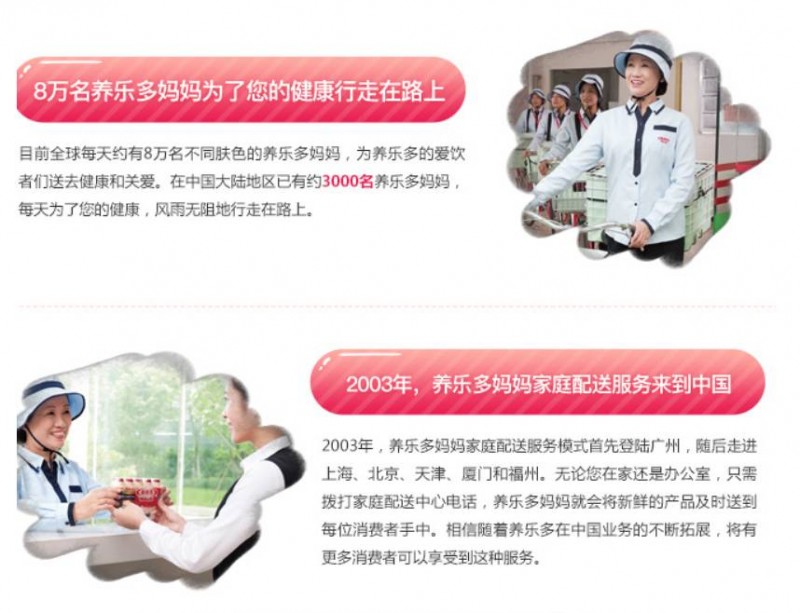 因此养乐多在全球有8万多名养乐多妈妈,在中国28个城市同样活跃着3000多名“妈妈”,每一位养乐多妈妈负责一片区域的送货和管理。