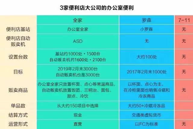 2013年8月,全家率先拓展办公室用便利店,现在大约在1000个场所设置了大约1500台便利店基站(办公室全家),到2019年2月底之前将扩展到3000台。罗森从今年7月份开始正式在东京23个区设置办公室内便利店基站(小罗森)