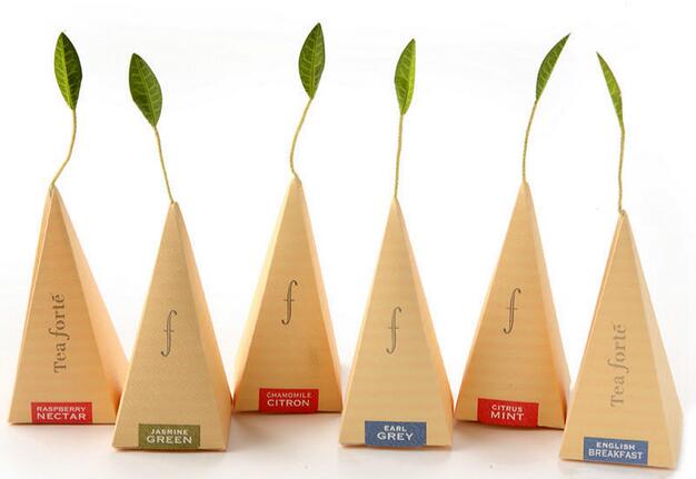当然,对于高档茶包品牌来说,包装创新的脚步从未停下,美国一家工匠茶公司TeaForté就是其中最夺人眼球的一家。该公司将传统的茶包细线以仿植物茎叶的粗棉线来替代,并在棉线上顶端附带了一片小茶叶,结合金字塔般的包装外形,宛如茶叶在茶包中生长。