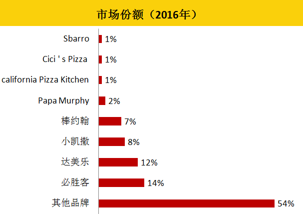 截止到2016年,46%的美国比萨市场份额集中在几大比萨公司的手中。虽然占据着最大的市场份额,但是这几大品牌的未来却不尽相同。