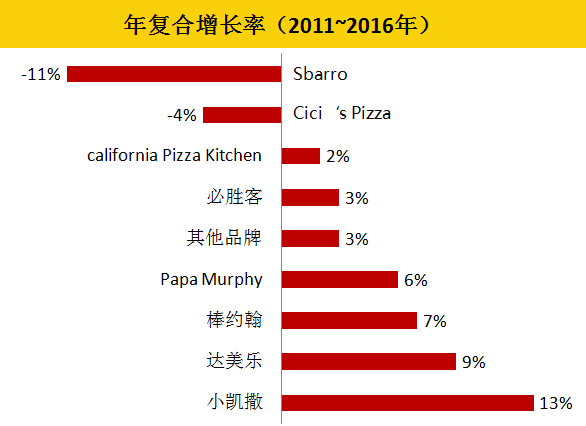 这三家虽然在市场份额的比例上低于必胜客,但是增长的势头却不能小看。尤其是小凯撒以年复合增长率13%遥遥领先,是必胜客的四倍还多。