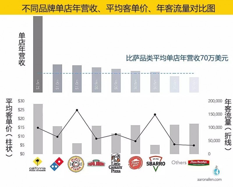 从图表中我们可以看出,Cici比萨和Sbarro比萨属于薄利多销的经营策略(客单价低,客流量高)。相比其他比萨连锁品牌,它们的价位真的是便宜了一半不止。但是低价策略也无法挽救负增长的营业额。