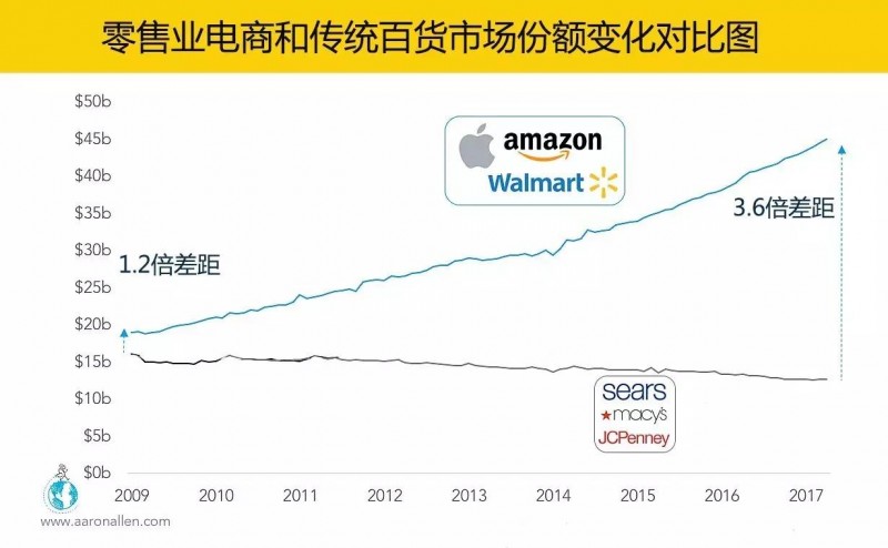 零售行业比餐饮行业更早的进入到激烈的竞争环境。原本的零售巨头西尔斯百货(Sears)和杰西潘尼(JC Penney)在遭遇了成本上涨、利润下降的市场考验时,没有快速调整策略,被黑马亚马逊改写了零售业巨头的格局。