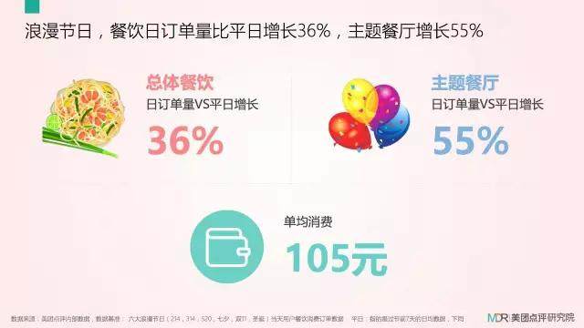 据美团点评研究院大数据的监测,相较于平日(节日前7天的日均数据),在浪漫节日来临之前,餐厅的订单量和主题餐厅都有很大的需求变化:总体餐饮的日订单量比平日增长36%,其中,主题餐厅的需求最大,日订单量比平时增长55%,单均消费达到105元。