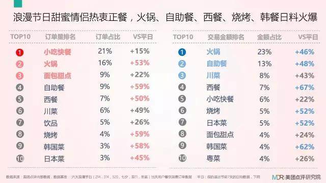 但是在这种特殊的节日里,小吃简快餐的订单增长远不如正餐品类,火锅、自助餐、西餐、日韩菜等5大正餐的订单量与平日相比,平均增长高达50%以上。