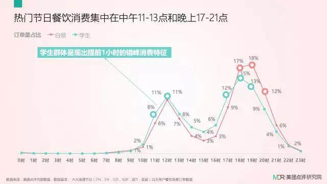 热门节日餐饮消费集中在中午11-13点和晚上17-21点,出现了双高峰的趋势。
