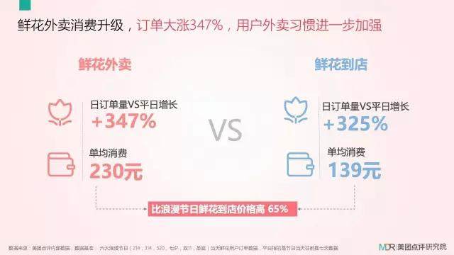 以上数据显示,在6大浪漫节日里,鲜花外卖日订单量增长347%,比鲜花到店价格高65%,其中,有86%的用户选择当天下单,“随订随送”趋势明显;此外,人们更热衷于在公共场合示爱“虐狗”,公共场合送花占比超过55%。