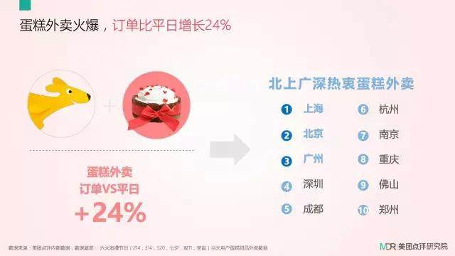 而蛋糕的消费场景也发生了改变,蛋糕已不仅仅是生日的必需品,在浪漫节日里,蛋糕外卖在北上广流行,订单量比平时提升24%。