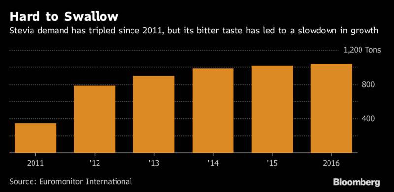 在过去的10年间,甜菊糖已经发展成为了价值40亿美元的全球产业,从可口可乐的碳酸饮料到卡夫亨氏的番茄酱中都有其身影。Euromonitor的数据显示,2011-2016年,甜菊糖的消费量增长了2倍。虽然在整个甜味剂(包括蔗糖)市场中,它所占的比重只是很小一部分,但作为零热量高甜度的一种天然来源提取物,甜菊糖的发展仍然是非常具有潜力的。