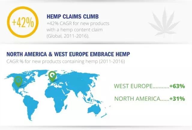 其中,在北美和西欧市场火麻作为一种健康配料,其应用更是迅猛增长,从2011到2016年,其年均复合增长率分别为31%和63%。